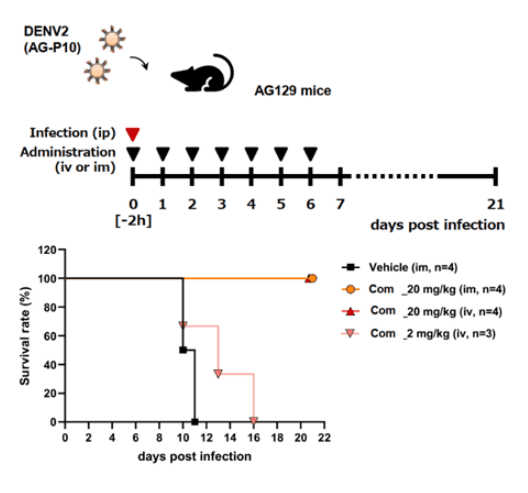 - 本化合物は、デングウイルス感染モデルマウスおよびSARS-Cov2感染モデルマウスの生存率を改善しウイルス複製を阻害した。