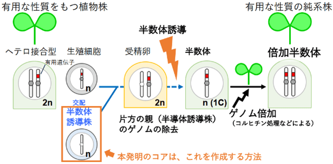 様々な種類の植物の半数体誘導株を単一遺伝子の導入により容易に作出する方法。作出した半数体誘導株により、様々な植物の有用株の半数体を得ることができ、それを倍加すれば、迅速に有用株純系を育種できる(倍加半数体育種法)
