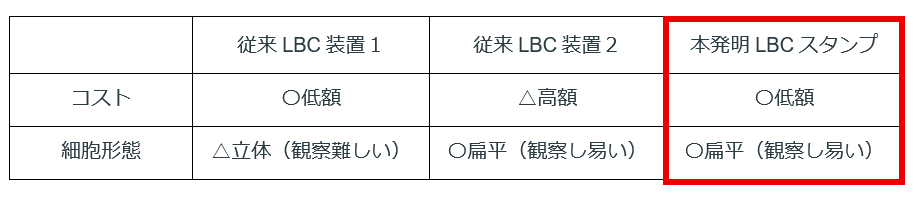 病理診断では、生検より低侵襲性の細胞診が広く採用される。 細胞診標本は、患者の口腔内や子宮頸部等からブラシ/綿棒/針などで採取した検体をスライドガラスに擦り付けて作製される。しかしながら、作製者の技術力によって、細胞量の多い/少ない、細胞が多層化、乾燥など、一定の品質に届かない標本が作製されてしまうことがあった。そこで、均質化、機械化、自動化などを目的に、液状化検体細胞診(LBC)が開発された。LBCは、採取された細胞を、溶液中に浮遊(液状化)させた後、スライドガラス上に堆積させる手法であり、検体の種類や作製者の技術に関わらず、一定品質の標本を作製することが可能になる。そのため、LBCは、広く普及してきている。本発明もLBCに含まれるため、以下に、従来のLBC装置と本発明の比較をまとめた。