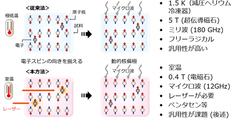 大阪大学の根耒誠教授らは、この課題を解決する新技術「トリプレットDNP法」を開発した。本法は、レーザー励起により三重項状態にしたペンタセン分子を偏極源とし、マイクロ波照射と磁場掃引を組み合わせることで核スピンを偏極する。この技術は高効率に偏極できることから、通常のNMRにくらべて信号強度が1万倍も強くなった。それだけでなく、偏極の寿命が長い(10分以上)、室温かつ低磁場(0.4 T電磁石)で実行できるという実用面の大きな利点がある。