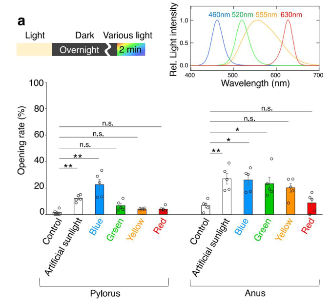 - 幽門(食べる):青色光(Blue, 460 nm)に対して顕著な依存性を示し、特異的に開口