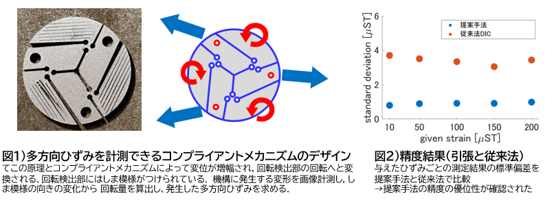 本技術は、測定対象の微小なひずみ(伸び縮み)を、独自の弾性変形機構(ターゲット)内部でテコの原理を用いて増幅し、画像解析が容易な「回転運動」へ変換する。肉眼では判別不能な微小変位も、回転角という物理量に変換することで、汎用カメラでも高いS/N比で検出可能とした。これにより、電源レスかつ非接触でありながら、従来のDICでは捉えきれなかった微小領域のひずみ計測を実現している。