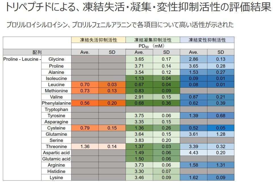 従来の凍結保護剤(糖類系、アルコール系、モノマーアミノ酸系)が%オーダーの添加を要するのに対し、本ペプチドはmMオーダーの低濃度で高い凍結保護効果を発揮