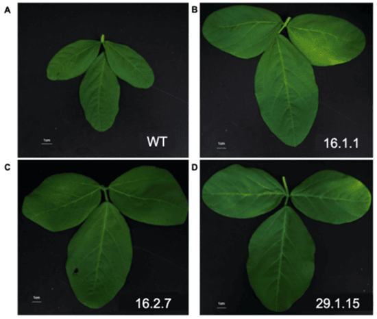- ダイズにおけるin plantaゲノム編集:光周性や開花時期に関与するGmPPD1およびそのホモログGmPPD2を標的としたin planta型ゲノム編集を実施した結果、標的配列に挿入・欠失・置換を含む多様な変異を確認した。得られた変異はT1世代においても継承され、葉の大型化などの表現型変化も観察された(図)。