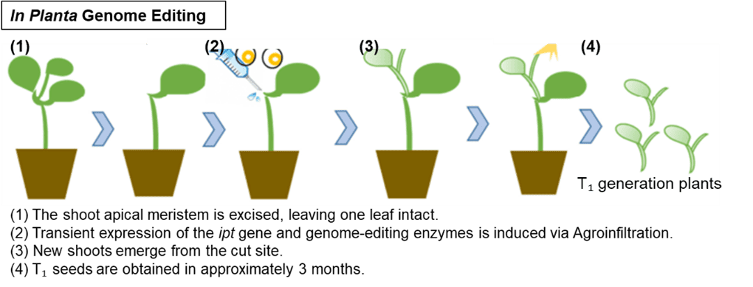 一般的なゲノム編集による植物遺伝子改変には、形質転換体の作出や組織培養が必要であり、特にダイズやミヤコグサなど組織培養が困難な植物種では、ゲノム編集の適用が難しいとされていた。